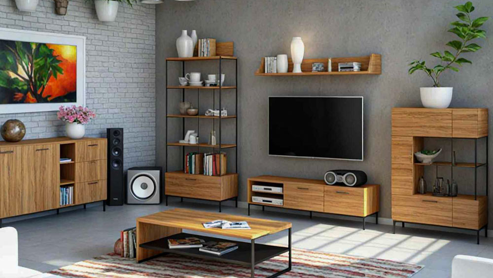 Rafturile ofera spatiu de depozitare si oportunitati de decorare. Alternati obiectele decorative cu carti si plante pentru a crea un aspect echilibrat. Asigurati-va ca rafturile nu obstructioneaza vizionarea si ca exista suficient spatiu pentru ventilatia televizorului.