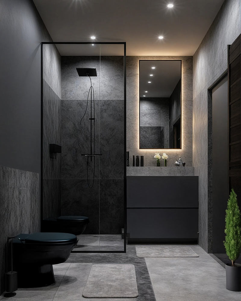 Pentru baie, nuantele de gri evoca luxul spa-urilor moderne, mai ales cand sunt combinate cu marmura si accesorii stralucitoare.