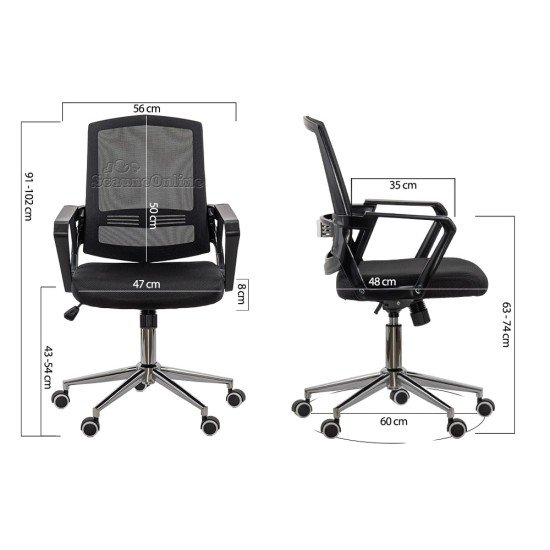 Main features Ergonomics and comfort: The chair is equipped with a number of adjustable functions to meet the individual needs of each user. The height of the chair can be adjusted according to preferences, ensuring an optimal position at the desk. Mobility: The seat is rotatable, allowing for slight lateral movement. The swing mechanism can be locked in a vertical position, providing stable support while working. High Quality Materials: The chair is made of laminated wood, covered with a dense sponge and upholstered with black fabric. The back is made of black mesh, which allows better air circulation. Robust construction: The base of the chair is made of chrome-plated steel, giving it increased strength and durability. The arms are fixed, made of black polypropylene, providing additional support for the arms. Floor protection: Special rubberized rollers are designed to protect wooden or parquet floors. size Maximum seat height: 54 cm Total seat height: 102 cm Seat width, including arms: 63-74 cm Benefits Durability and stability: Chrome base and polypropylene arms ensure long-term use. Personalized comfort: Multiple adjustments allow the seat to be adjusted to individual needs. Easy to maintain: The materials used are easy to clean and maintain. Extended warranty: The product comes with a 24-month warranty, assuring you of its quality and durability. Load capacity: The maximum weight allowed is 100 kg, suitable for a wide range of users. Guarantee The OFF 624M office chair model benefits from an extended 24-month warranty, which reflects the manufacturer's confidence in the quality and durability of the product.