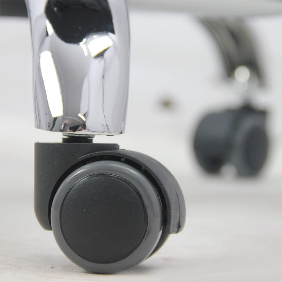 Baza scaunului, în formă de stea, este realizată din oțel cromat, iar rolele sunt special concepute pentru a proteja parchetul, având un strat de cauciuc dur gri, care asigură o mobilitate lină și protecție a podelei.